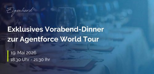 Eigenherd & Salesforce – Gemeinsam Energie zukunftsfähig machen – Agentforce World Tour 2026, Frankfurt 20. Mai 2026 | 08:00 – 18:00 Uhr | Messe Frankfurt, Halle 3 Die Energiebranche steht weiterhin vor großen Herausforderungen: steigende Kundenerwartungen, regulatorische Anforderungen und der zunehmende Einsatz von Künstlicher Intelligenz verändern Geschäftsmodelle und Prozesse nachhaltig. Umso wichtiger sind durchgängige,…