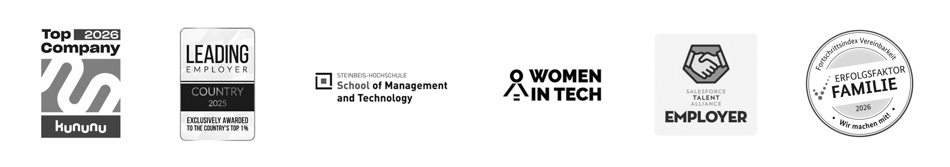 Für unsere familienbewusste Unternehmenskultur erhalten wir seit 2022 das Siegel Erfolgsfaktor Familie, einer Initiative des Bundesministeriums für Familie, Senioren, Frauen und Jugend. Seit 2023 sind wir Fördermitglied bei Women in Tech e.V.. Durch die Kooperation bieten wir Frauen verschiedene Perspektiven im Salesforce-Partner-Ökosystem und empowern sie, ihre Liebe zur Tech-Branche zu entdecken, zu fördern und auszubauen.
